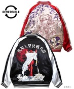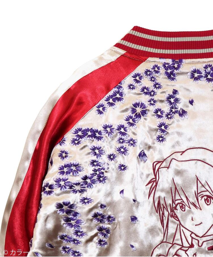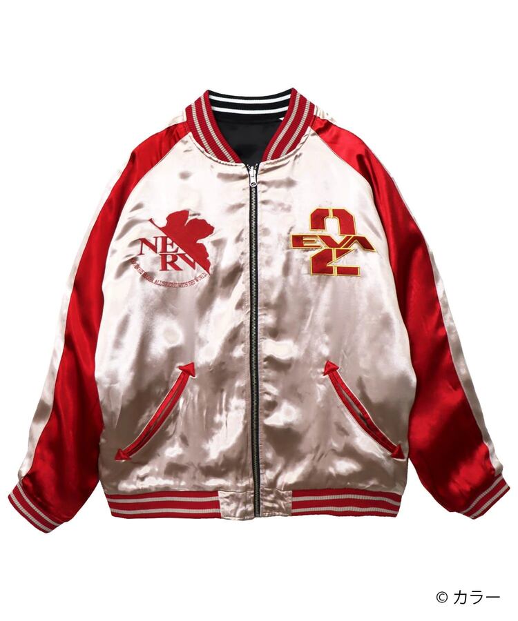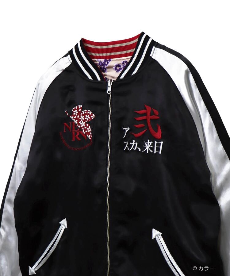 『新世紀エヴァンゲリオンTV版』にて、マントに身を包んで洋上の戦艦の上に乗った状態で初登場となるEVA弐号機をバックモチーフとして描きました。マントの陰影や波のしぶきなどグラデーションとなる部分を繊細な刺繍糸の選択により、臨場感あふれる一枚に仕上げました。フロントにはNERVマークをオマージュし、TVのタイトルロゴを『弐』の一文字と組み合わせたデザインを配置しました。全てのデザインは、職人技が光る刺繍技術で施しております。その刺繍の一針一針は、長年スカジャンの刺繍を行ってきた匠の技として、価値のある逸品として完成されています。