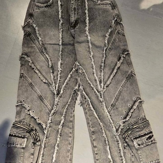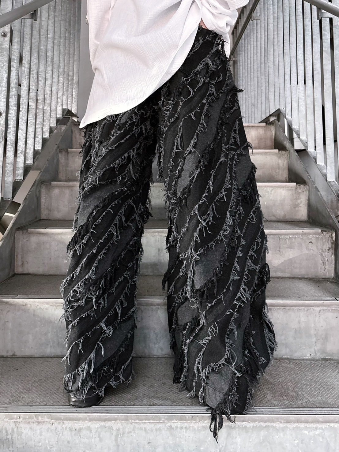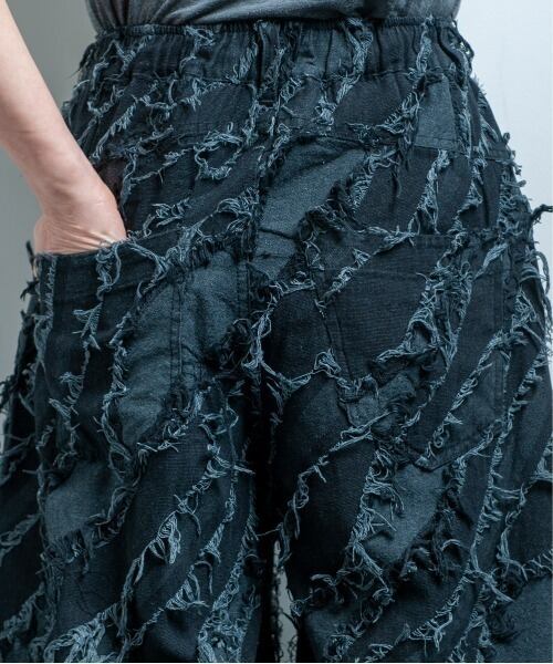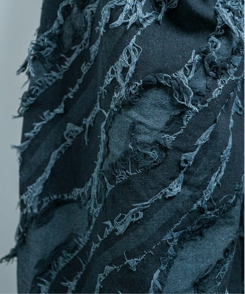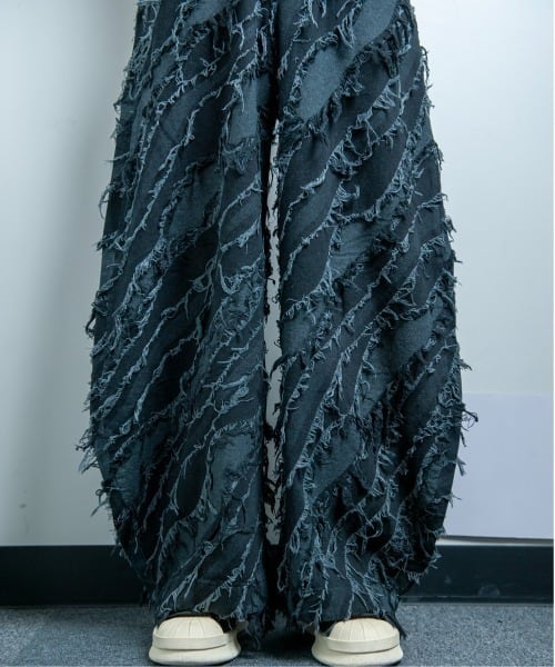 インパクト抜群のフリンジ加工やジャガード織、極太ワイドシルエットがポイントのストリート感溢れる一枚。