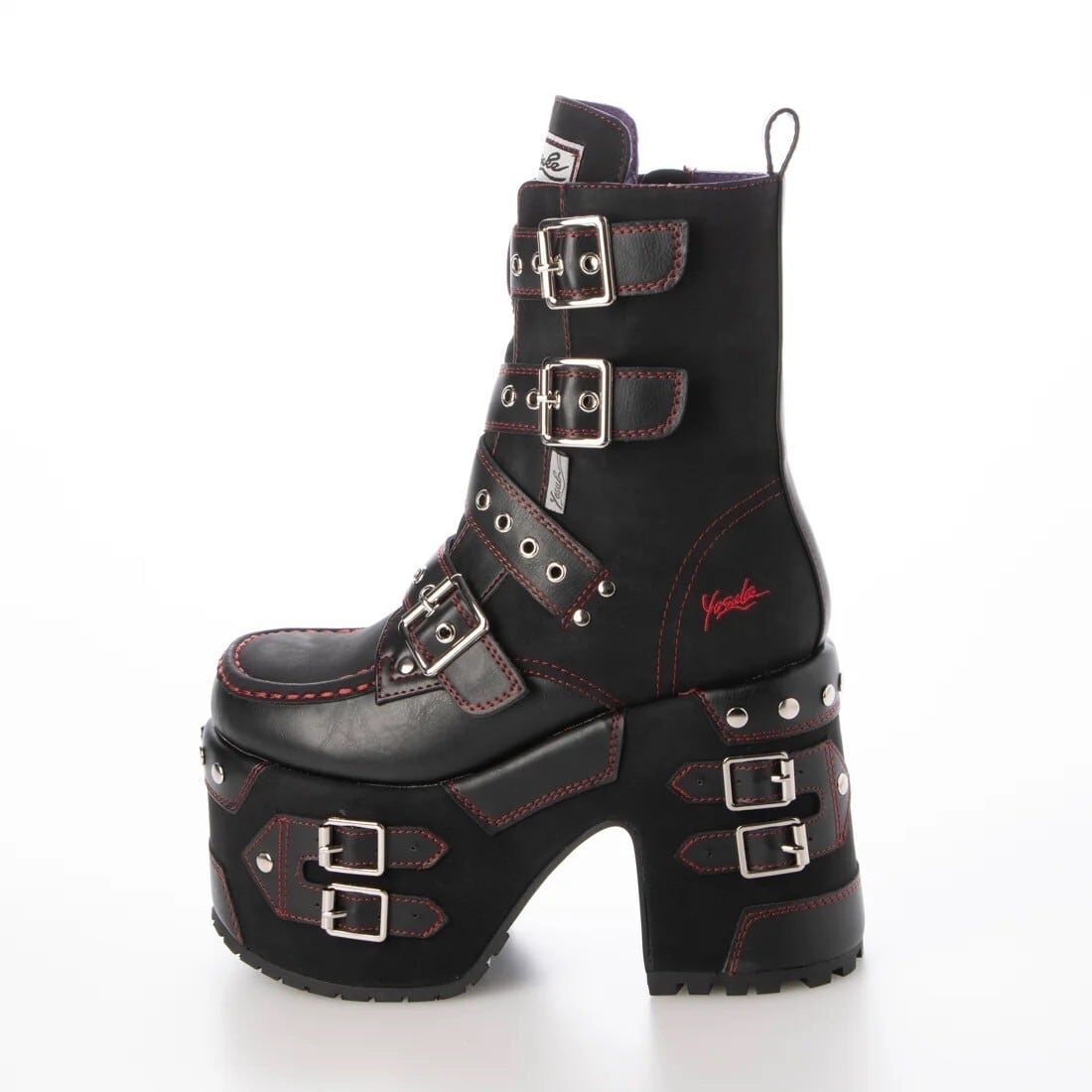 厚底ソールで存在感抜群のブーツ。 多重ベルトやスタッズが目を引く1足 内側ジッパーでサッと脱ぎ履き出来るのも嬉しいところ♪ パンツスタイルにもスカートにも相性◎ サイズ(cm) S-22.5 M-23.5 L-24.5 ヒールの高さ :12.0cm 筒丈(cm) :17.0cm 筒周り(cm) :25.0cm 靴幅 :3E(広め)